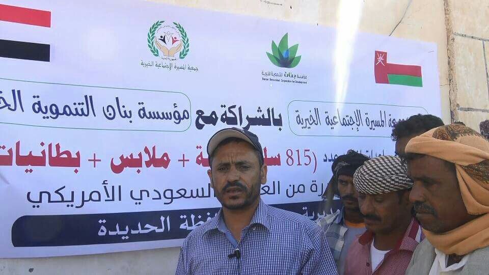 وسط مخاطر القصف المكثف لطيران العدوان السعودي الامريكي على منطقة حيس والخوخة والتحيتا وتحت ازيز طائرات التي تقصف كل شي يتحرك على تلك الطريق كان فريق مجاهدي جمعيه المسيرة الاجتماعية الخيرية يستمر في التحرك بعون الله والعطاء لمد يد العون والمساعدة لكل ابناء اليمن في كل المناطق حتى النصر المبين، حيث قامت جمعية المسيرة الاجتماعية الخيرية بتوزيع 850 سلة غذائية وبطانيات وملابس وذلك بالشراكة مع مؤسسة بنان التنموية واستهدفتا المتضررين بمنطقة حيس محافظة الحديدة.
