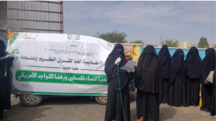 نظمت الأكاديمية العليا للقرآن الكريم - قسم البنات- اليوم بأمانة العاصمة وقفة حاشدة غضبًا واستنكارًا للاعتداء الصهيوني السافر على خمس نساء فلسطينيات، ورفضًا للتواجد الأمريكي في السواحل والأراضي اليمنية.