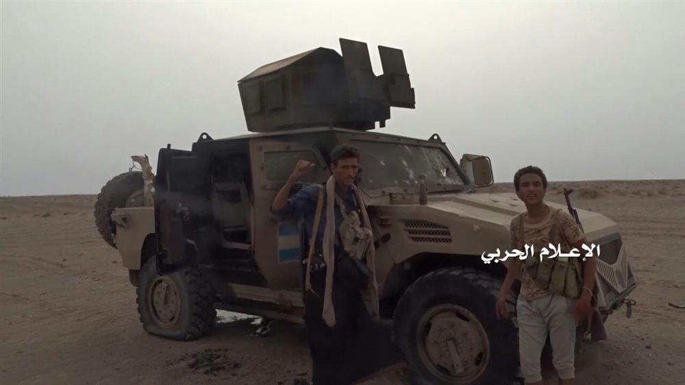 ووثقت عدسة الإعلام الحربي لحظة استهداف آلية عسكرية للمرتزقة بصاروخ موجه كانت تحمل معد عيار 14.5 ما أدى إلى تدميرها.